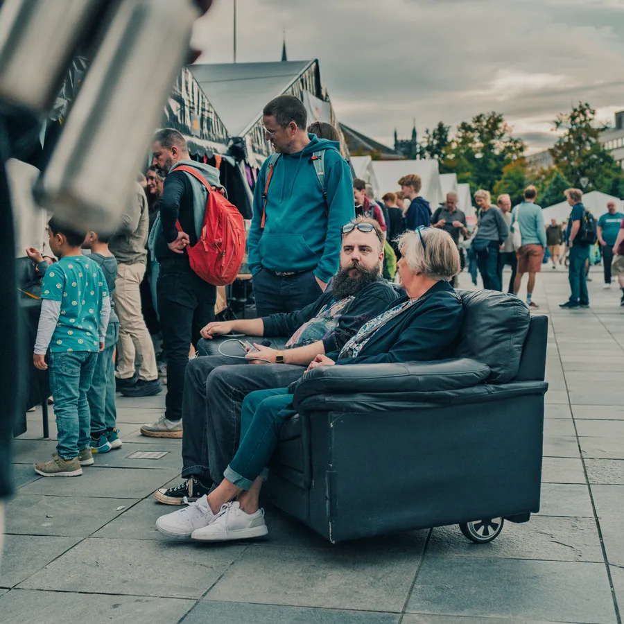 Vår smått legendariske, kjørende sofa var selvsagt med på turen! Årets store oppgradering? Makita-batterier! Endelig kunne vi cruise rundt uten å bekymre oss for at strømmen tok slutt på andre siden av torget.